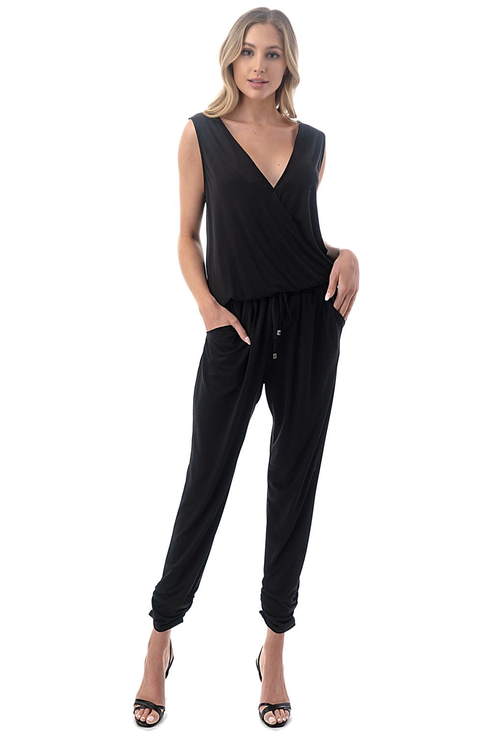 Features: Elastic waistband with drawstring, side pockets, ruched ankle detail